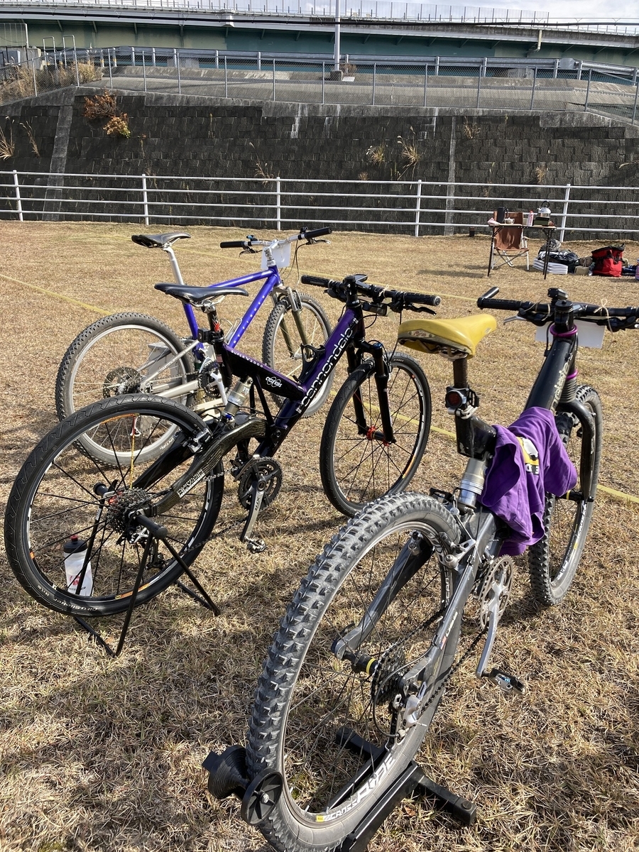 CannondaleのSuper-V2台。奥のリアスイングアームはカーボン製。この見てくれでXCバイクですからね。恐ろしや。