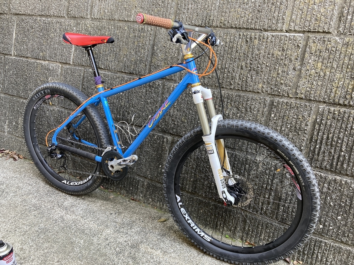 Cannondaleのフルリジッド。ペイントロゴカラーに合わせた部品の差し色がおしゃれ。